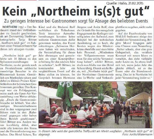 Wenn Northeimer Spitzenrestaurants und eine Konditorei ihre Stände auf dem Northeimer Marktplatz aufbauen, dann freuen sich alle Northeimer und viele Besucher aus dem nahen und weitem Umland auf anspruchsvolle Open-Air-Gastronomie. In wenigen Jahren wurde "Northeim isst gut" zum Vorbild für Städte aus der Region. Lecker essen und gut trinken sind die einen Kennzeichen von "Northeim isst gut". Die anderen sind Sehen- und Gesehenwerden.